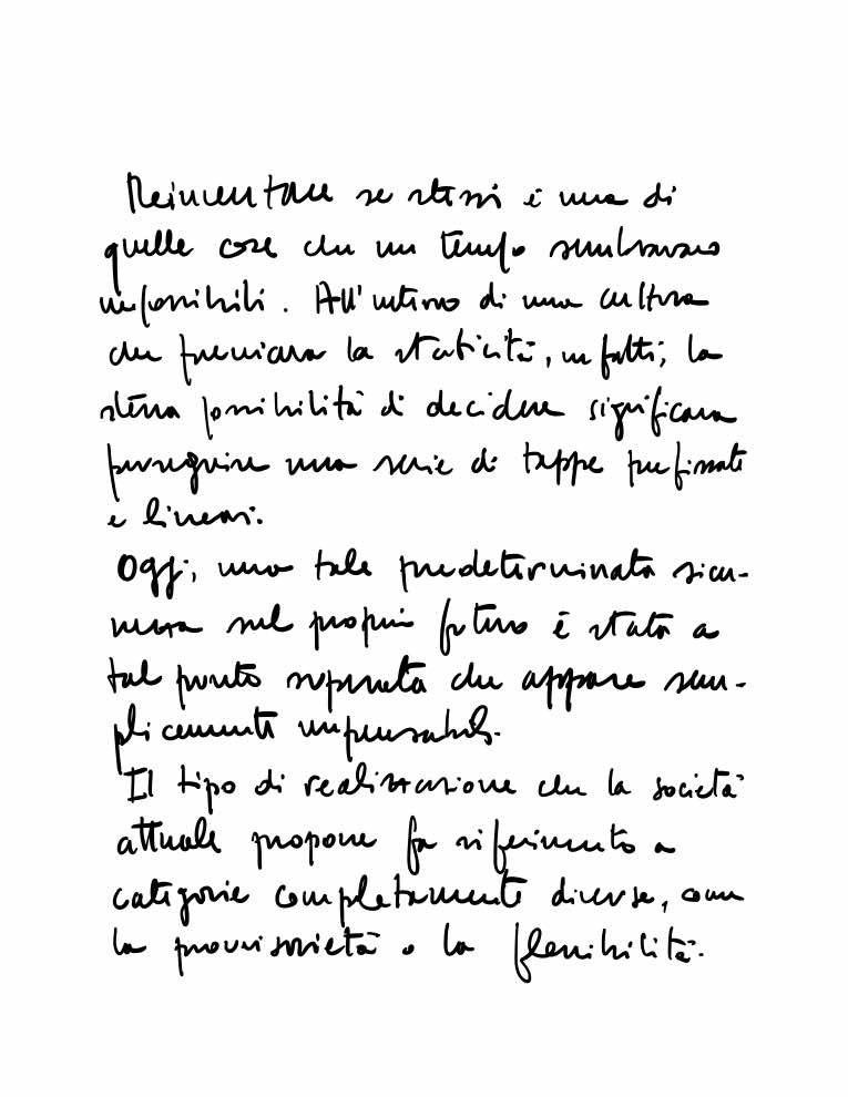 Oggi, una tale predeterminata sicurezza sul proprio futuro è stata a tal punto superata che appare semplicemente impensabile. Il tipo di realizzazione che la società attuale propone fa riferimento a categorie completamente diverse, come la provvisorietà o la flessibilità.