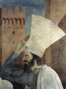 I refer to the Exaltation of the Cross, an episode from Piero della Francesca’s “Stories of the True Cross” cycle at the Basilica of San Francesco in Arezzo. In it a scene is shown that is imagined to have occurred following the finding of the cross of Christ, brought back by Heraclius to Jerusalem.